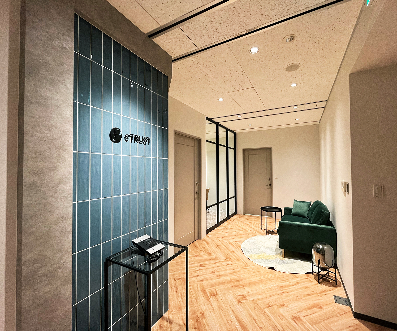 部署によって就業時間・業務内容が違い、部署ごとに空間を分ける必要があったため、視線の方向・動線を細かく計画したオフィスをご提案しました。部署間を完全に分断してしまわぬよう、執務の空間自体は壁を立てず緩やかにつなげ、間にコミュニケーションスペースを置き、偶発的な社員の交流が生まれるように設計。素材は木、モルタル、ガラスでカジュアルな雰囲気でまとめ、家具やタイルで色を出しアクセントをつけています。